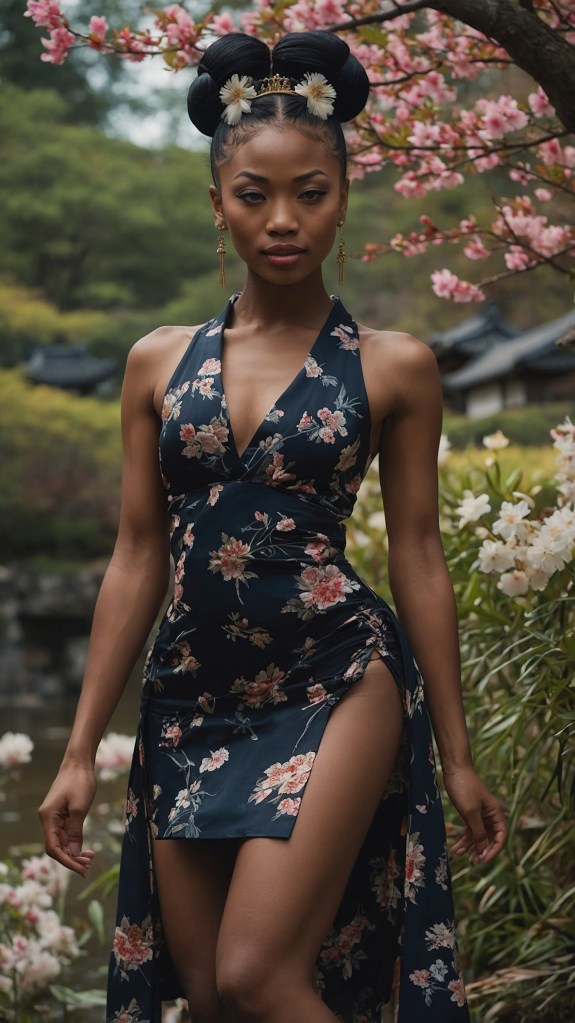 Tokyo brillait sous les néons du soir. Au cœur du quartier discret de Kagurazaka, la petite maison de thé où Zya travaillait ouvrait ses portes aux derniers invités. Elle s’y déplaçait avec grâce, enveloppée d’un kimono de soie noire brodé d’iris violets. Sa peau sombre, satinée, contrastait magnifiquement avec la blancheur rituelle de son maquillage.